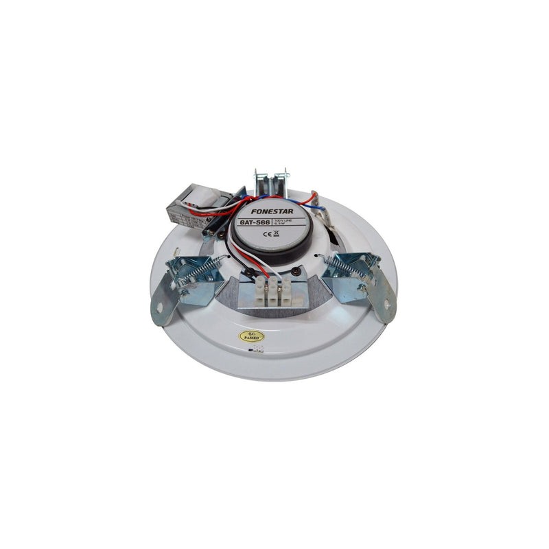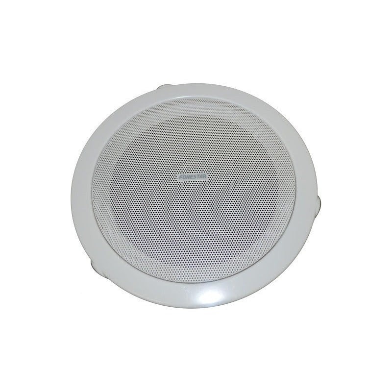 Altavoz de techo de 5” pulgadas doble cono con transformador de línea 100 V y rejilla redonda, potencia: 6 watts RMS y 10 watts máximo, respuesta de frecuencia: 110 - 15,000 Hz, impedancia: alta Z línea 100 V: 1,660 ohms (6 watts), 3,330 ohms (3 watts), sensibilidad: 90 dB a 1W/1m, ángulo de cobertura: 130°, material: acero, color blanco, dimensiones: 200 x 57 mm, orificio: 170 mm, peso: 0.7 kg, sistema de instalación rápida.